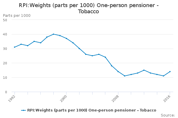 Download this time seriesRPI:Weights (parts per 1000) One-person pensioner - Tobacco