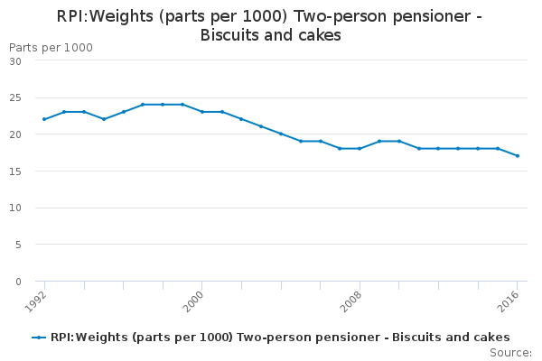 Download this time seriesRPI:Weights (parts per 1000) Two-person pensioner - Biscuits and cakes