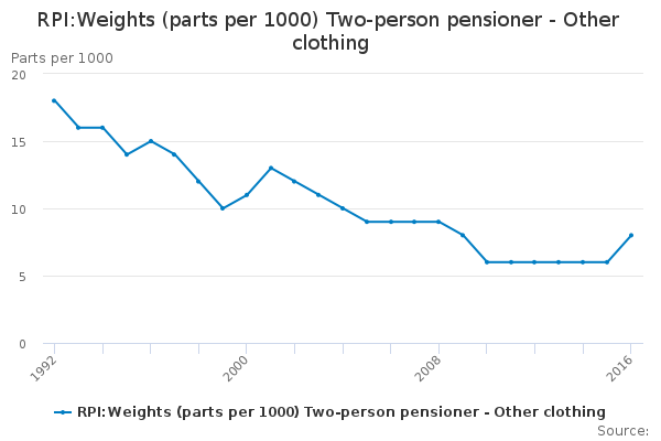 Download this time seriesRPI:Weights (parts per 1000) Two-person pensioner - Other clothing