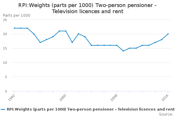 Download this time seriesRPI:Weights (parts per 1000) Two-person pensioner - Television licences and rent