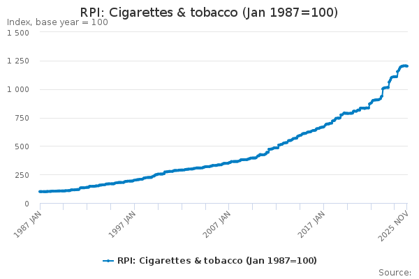 Download this time seriesRPI: Cigarettes & tobacco (Jan 1987=100)