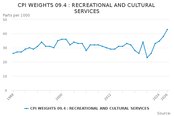 Download this time seriesCPI WEIGHTS 09.4 : RECREATIONAL AND CULTURAL SERVICES