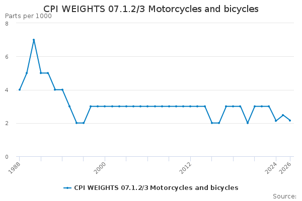Download this time seriesCPI WEIGHTS 07.1.2/3 Motorcycles and bicycles