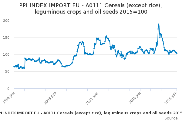 Download this time seriesPPI INDEX IMPORT EU - A0111 Cereals (except rice), leguminous crops and oil seeds 2015=100