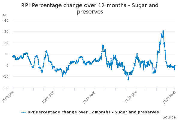 Download this time seriesRPI:Percentage change over 12 months - Sugar and preserves