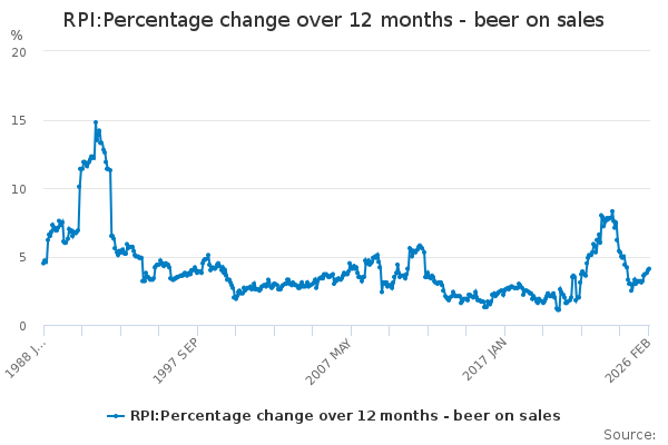 Download this time seriesRPI:Percentage change over 12 months - beer on sales