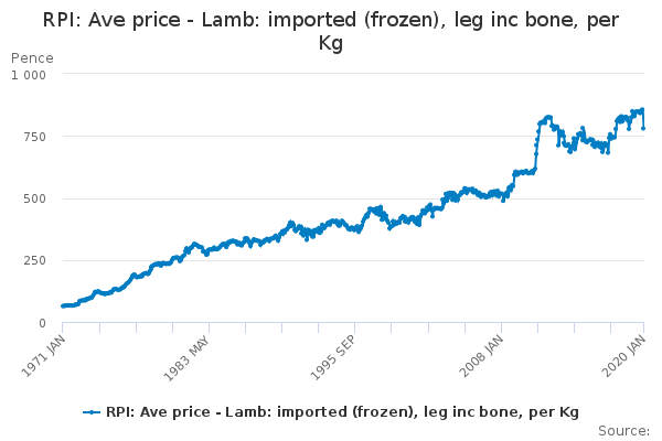 Download this time seriesRPI: Ave price - Lamb: imported (frozen), leg inc bone, per Kg