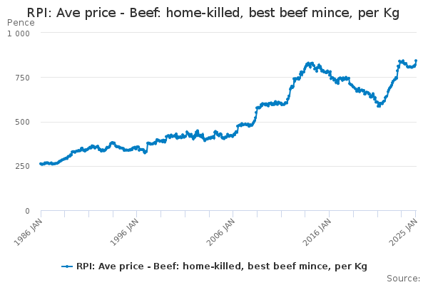 Download this time seriesRPI: Ave price - Beef: home-killed, best beef mince, per Kg