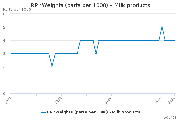 Download this time seriesRPI:Weights (parts per 1000) - Milk products