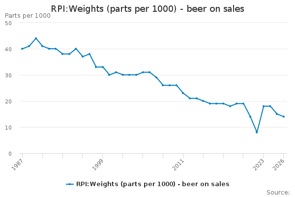 Download this time seriesRPI:Weights (parts per 1000) - beer on sales