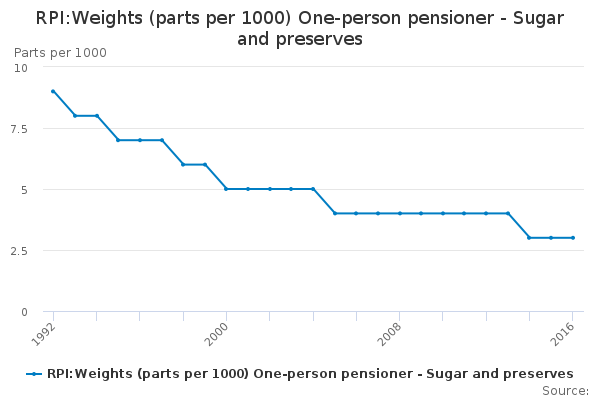 Download this time seriesRPI:Weights (parts per 1000) One-person pensioner - Sugar and preserves
