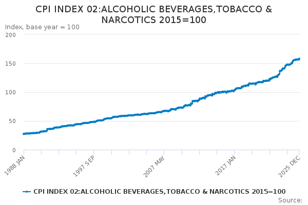 Download this time seriesCPI INDEX 02:ALCOHOLIC BEVERAGES,TOBACCO & NARCOTICS 2015=100
