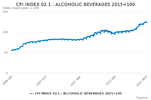 Download this time seriesCPI INDEX 02.1 : ALCOHOLIC BEVERAGES 2015=100