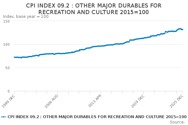Download this time seriesCPI INDEX 09.2 : OTHER MAJOR DURABLES FOR RECREATION AND CULTURE 2015=100