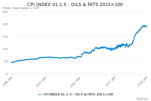 Download this time seriesCPI INDEX 01.1.5 : OILS & FATS 2015=100