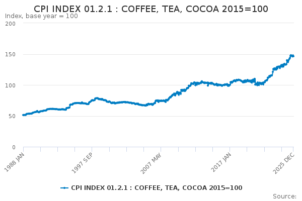 Download this time seriesCPI INDEX 01.2.1 : COFFEE, TEA, COCOA 2015=100