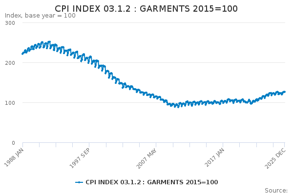 Download this time seriesCPI INDEX 03.1.2 : GARMENTS 2015=100
