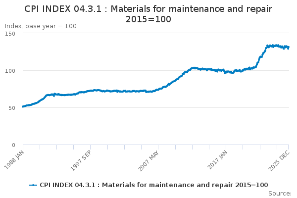 Download this time seriesCPI INDEX 04.3.1 : Materials for maintenance and repair 2015=100