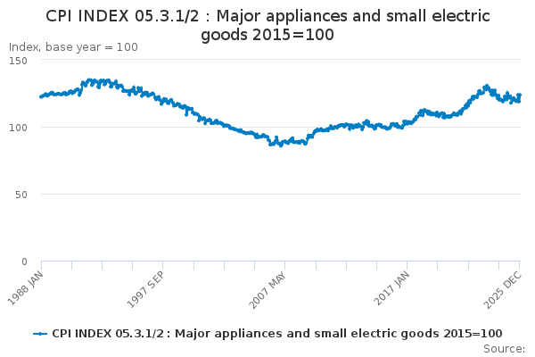 Download this time seriesCPI INDEX 05.3.1/2 : Major appliances and small electric goods 2015=100