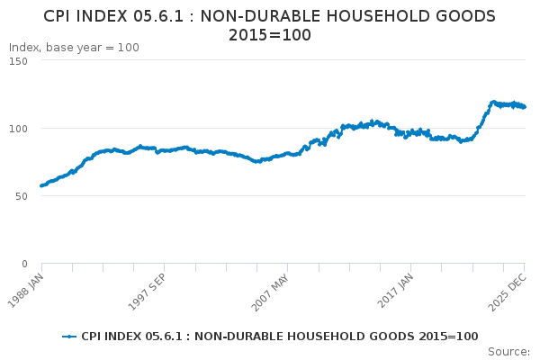 Download this time seriesCPI INDEX 05.6.1 : NON-DURABLE HOUSEHOLD GOODS 2015=100