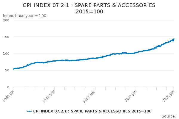 Download this time seriesCPI INDEX 07.2.1 : SPARE PARTS & ACCESSORIES 2015=100