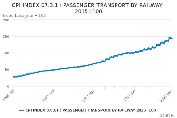 Download this time seriesCPI INDEX 07.3.1 : PASSENGER TRANSPORT BY RAILWAY 2015=100