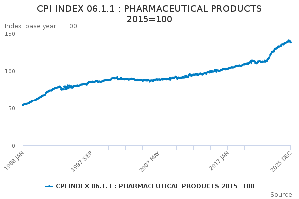 Download this time seriesCPI INDEX 06.1.1 : PHARMACEUTICAL PRODUCTS 2015=100
