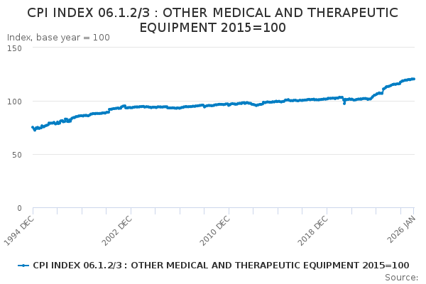 Download this time seriesCPI INDEX 06.1.2/3 : OTHER MEDICAL AND THERAPEUTIC EQUIPMENT 2015=100