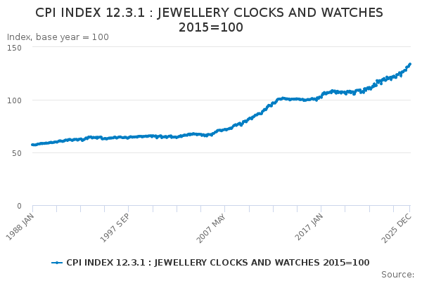 Download this time seriesCPI INDEX 12.3.1 : JEWELLERY CLOCKS AND WATCHES 2015=100
