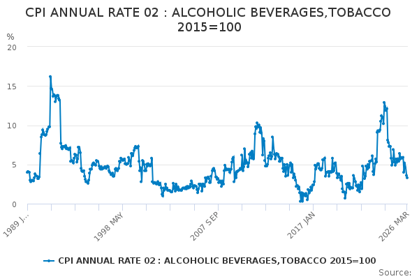 Download this time seriesCPI ANNUAL RATE 02 : ALCOHOLIC BEVERAGES,TOBACCO 2015=100