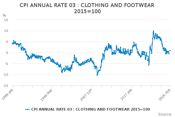 Download this time seriesCPI ANNUAL RATE 03 : CLOTHING AND FOOTWEAR 2015=100
