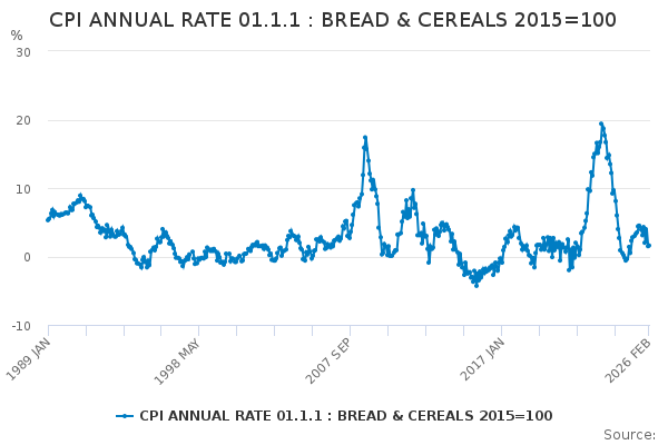 Download this time seriesCPI ANNUAL RATE 01.1.1 : BREAD & CEREALS 2015=100
