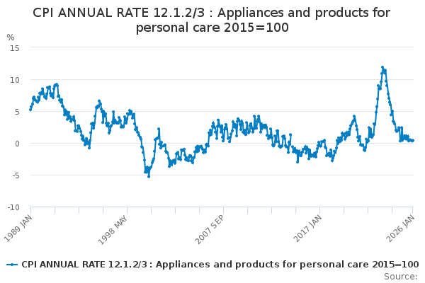 Download this time seriesCPI ANNUAL RATE 12.1.2/3 : Appliances and products for personal care 2015=100
