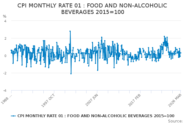 Download this time seriesCPI MONTHLY RATE 01 : FOOD AND NON-ALCOHOLIC BEVERAGES 2015=100