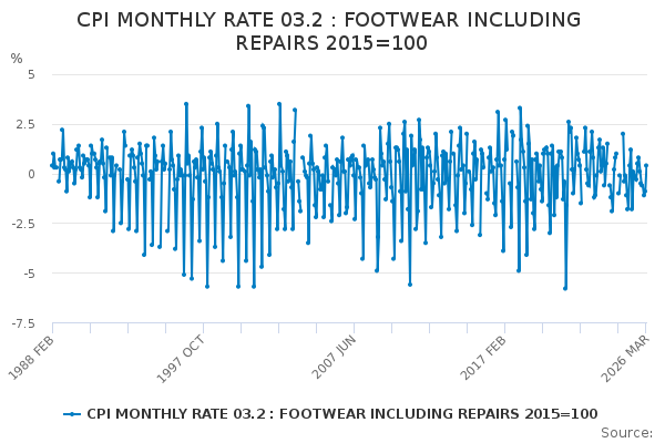 Download this time seriesCPI MONTHLY RATE 03.2 : FOOTWEAR INCLUDING REPAIRS 2015=100
