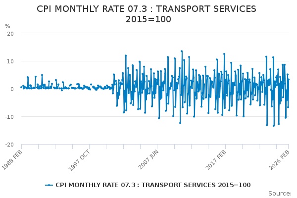 Download this time seriesCPI MONTHLY RATE 07.3 : TRANSPORT SERVICES 2015=100