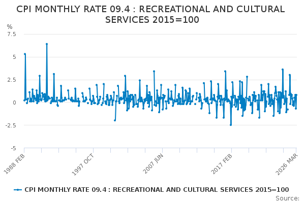 Download this time seriesCPI MONTHLY RATE 09.4 : RECREATIONAL AND CULTURAL SERVICES 2015=100