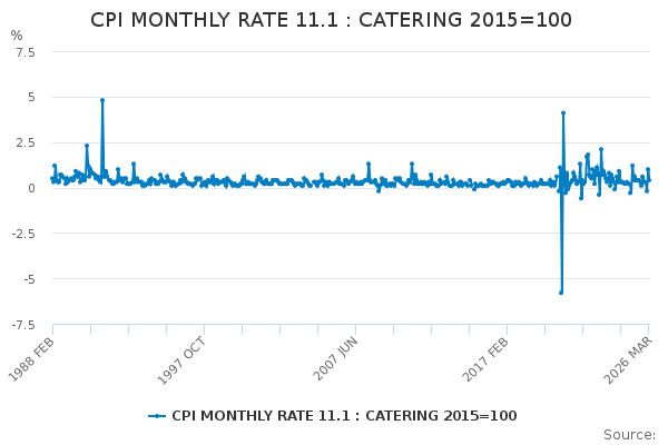 Download this time seriesCPI MONTHLY RATE 11.1 : CATERING 2015=100
