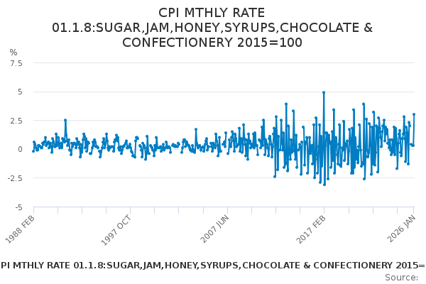Download this time seriesCPI MTHLY RATE 01.1.8:SUGAR,JAM,HONEY,SYRUPS,CHOCOLATE & CONFECTIONERY 2015=100