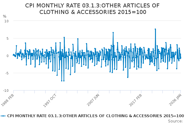 Download this time seriesCPI MONTHLY RATE 03.1.3:OTHER ARTICLES OF CLOTHING & ACCESSORIES 2015=100