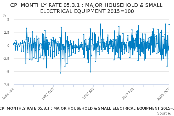 Download this time seriesCPI MONTHLY RATE 05.3.1 : MAJOR HOUSEHOLD & SMALL ELECTRICAL EQUIPMENT 2015=100
