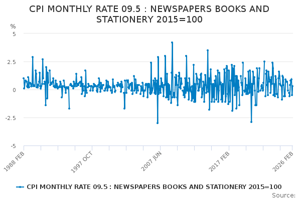 Download this time seriesCPI MONTHLY RATE 09.5 : NEWSPAPERS BOOKS AND STATIONERY 2015=100