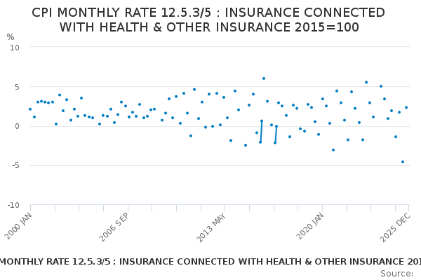 Download this time seriesCPI MONTHLY RATE 12.5.3/5 : INSURANCE CONNECTED WITH HEALTH & OTHER INSURANCE 2015=100