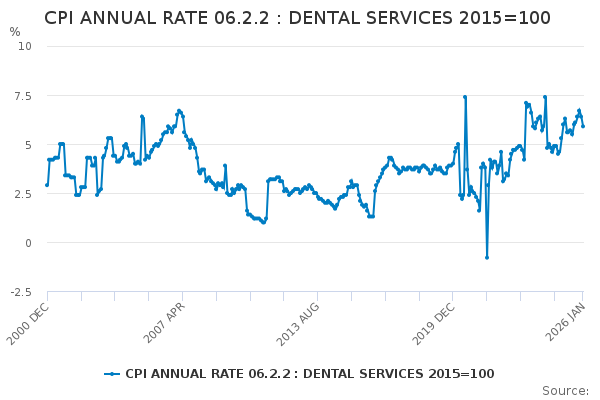 Download this time seriesCPI ANNUAL RATE 06.2.2 : DENTAL SERVICES 2015=100