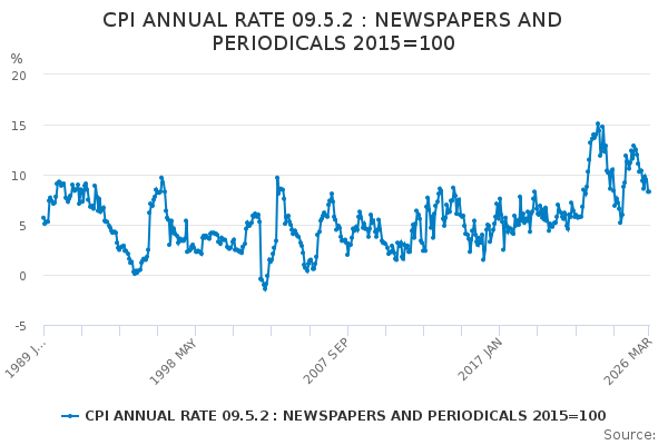 Download this time seriesCPI ANNUAL RATE 09.5.2 : NEWSPAPERS AND PERIODICALS 2015=100