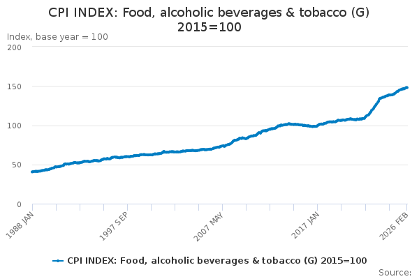 Download this time seriesCPI INDEX: Food, alcoholic beverages & tobacco (G) 2015=100