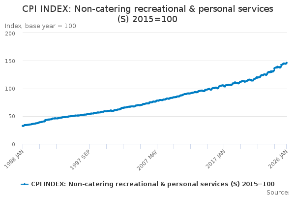 Download this time seriesCPI INDEX: Non-catering recreational & personal services (S) 2015=100