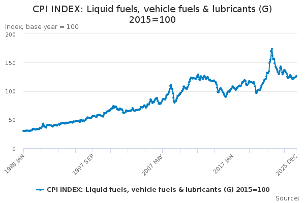 Download this time seriesCPI INDEX: Liquid fuels, vehicle fuels & lubricants (G) 2015=100