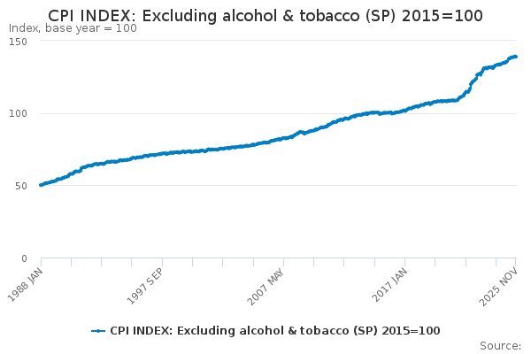 Download this time seriesCPI INDEX: Excluding alcohol & tobacco (SP) 2015=100