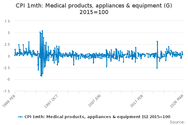 Download this time seriesCPI 1mth: Medical products, appliances & equipment (G) 2015=100